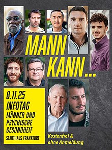 Infotag Männer und psychische Gesundheit. Man kann... Reden, überfordert sein, fürsorglich sein, fühlen, psychisch krank sein, einsam sein, sich Hilfe holen, sensibel sein, nicht mehr wollen, sich un sich kümmern und zum Infotag Männer kommen. Alle Infos bei FRANS.