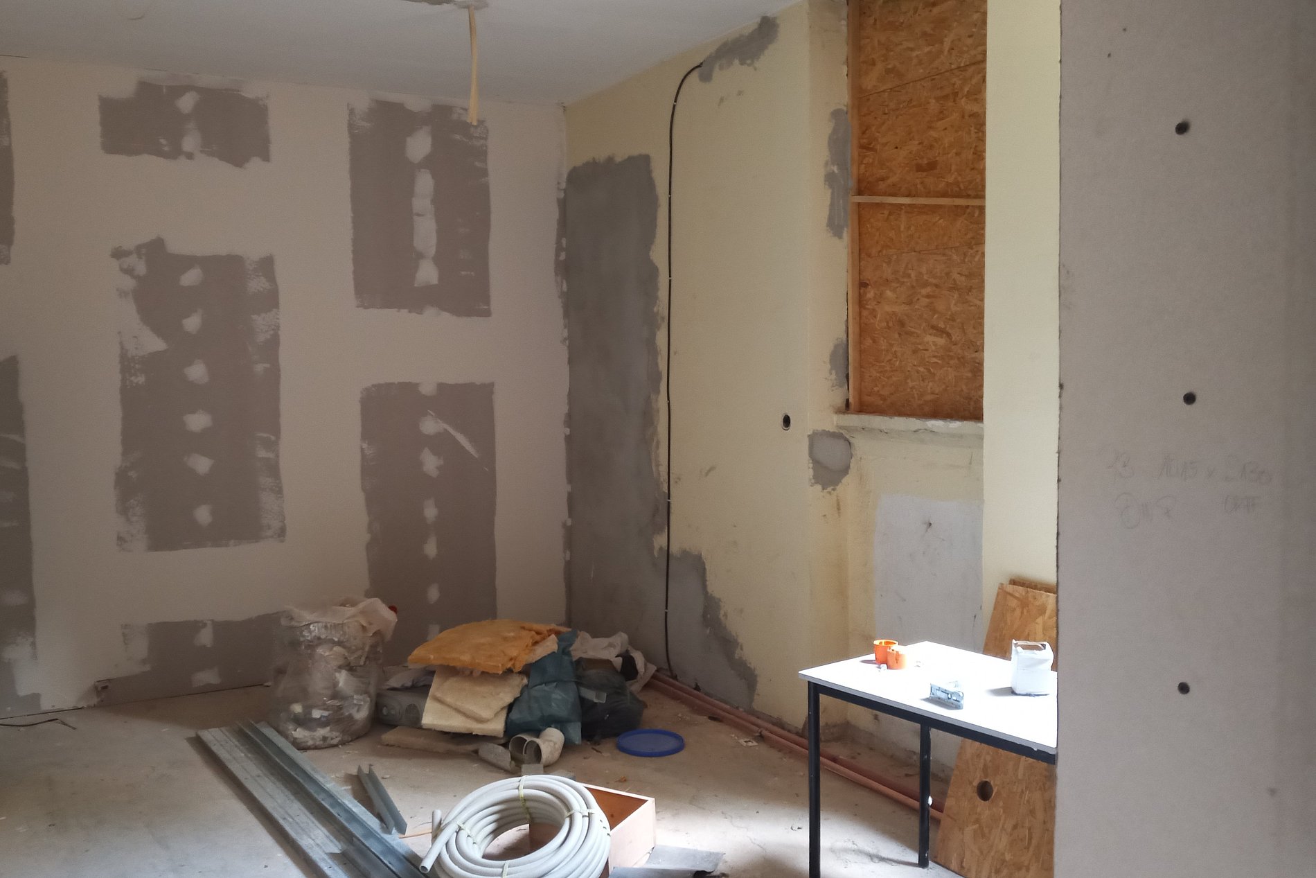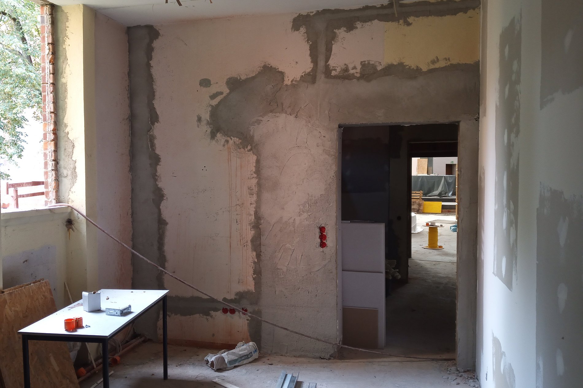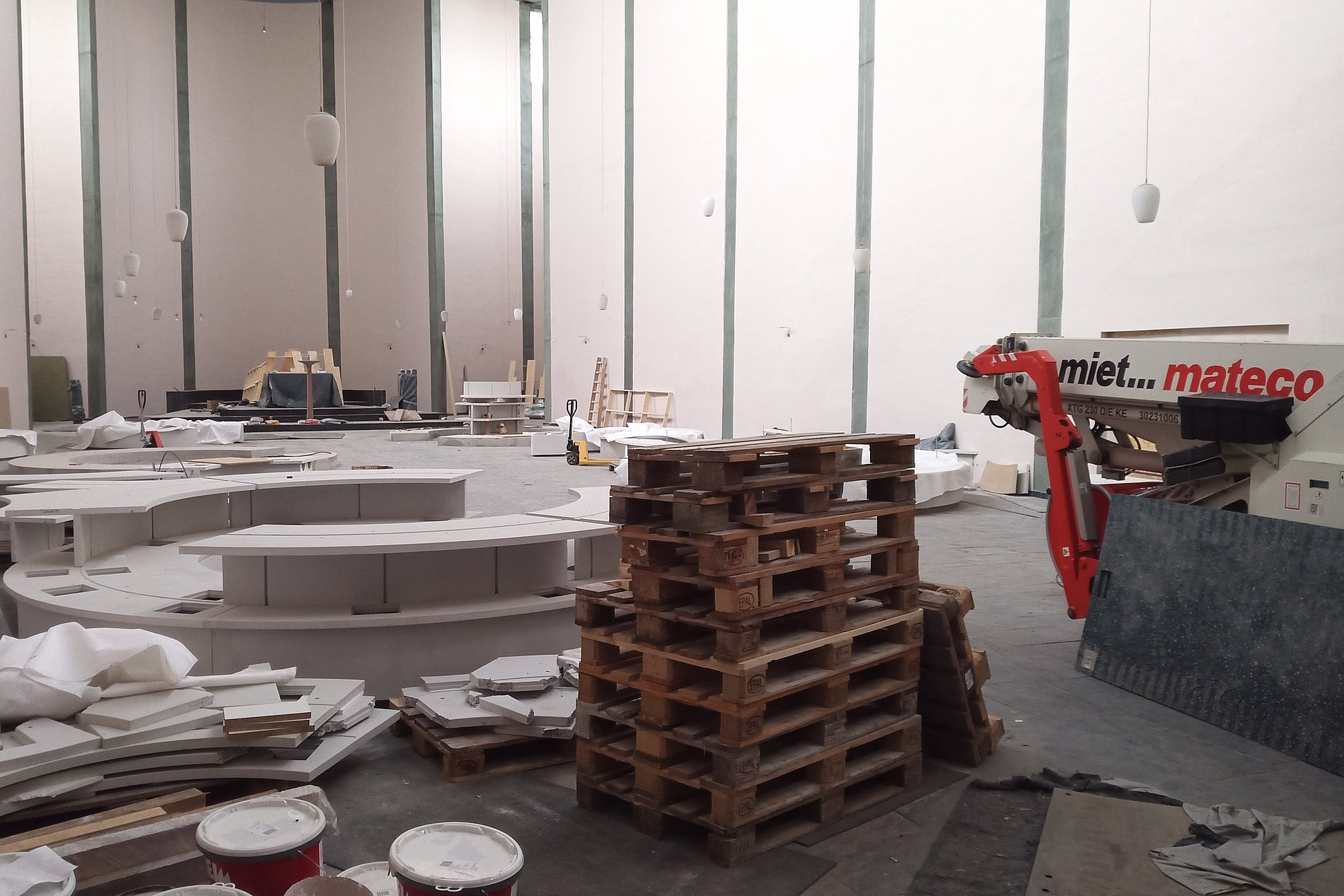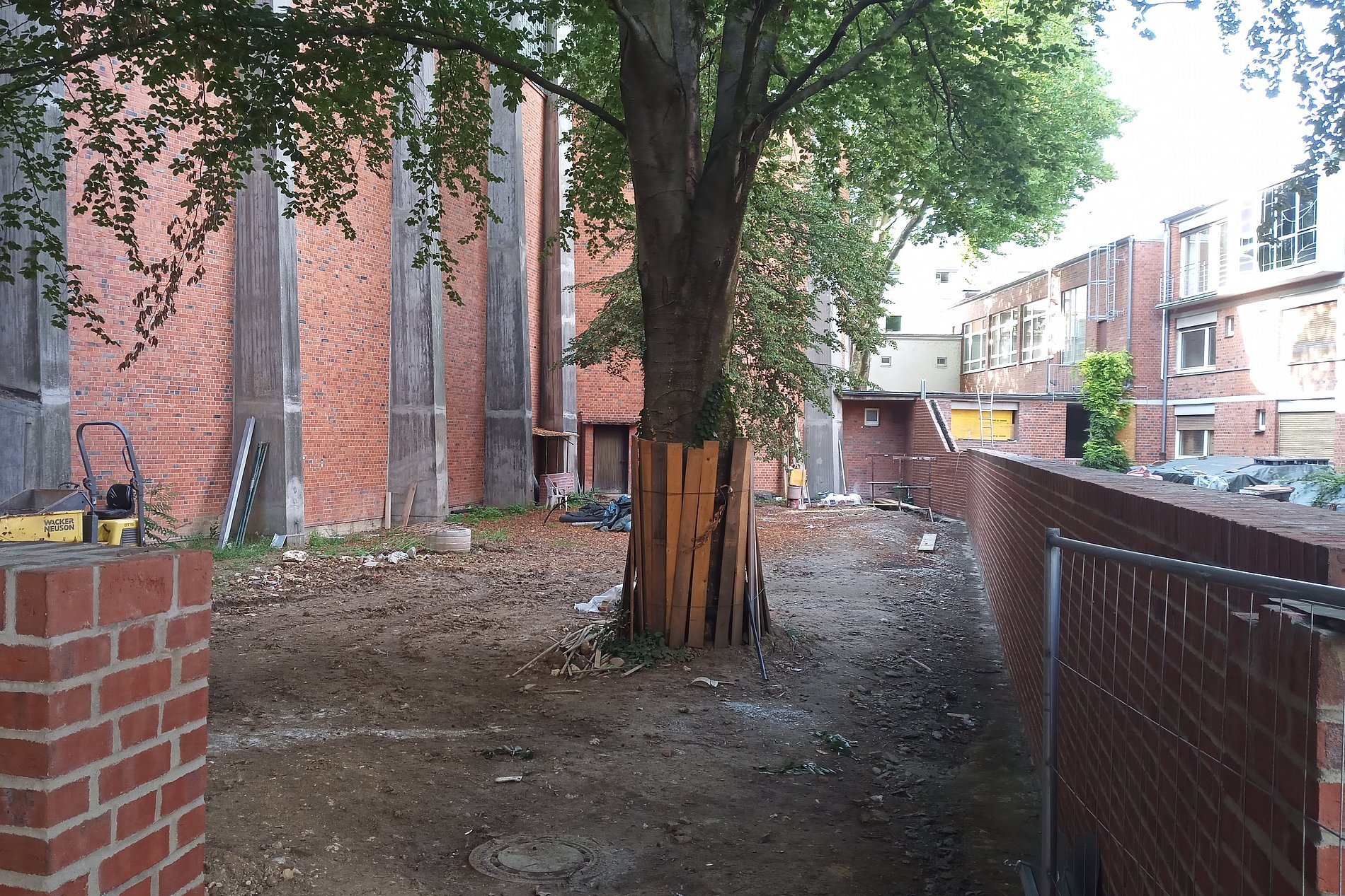 Im Mai und Juni 2025 ging es mit großen Schritten voran. Unsere Leiterin Verena Maria Kitz war mehrmals auf der Baustelle und steht im engen Austausch mit Architektinnen und dem Bauleiter. Viel Material wurde angeliefert und verarbeitet. Ein Bauwagen und später auch ein Zelt standen vor unserer Kirche. Und auch an den Nebenräumen in unserer Sakristei ging es gut voran. Die Wänder der Kirche wurden komplett neu angelegt. Daher konnte auch mit dem Gerüstabbau begonnen werden.