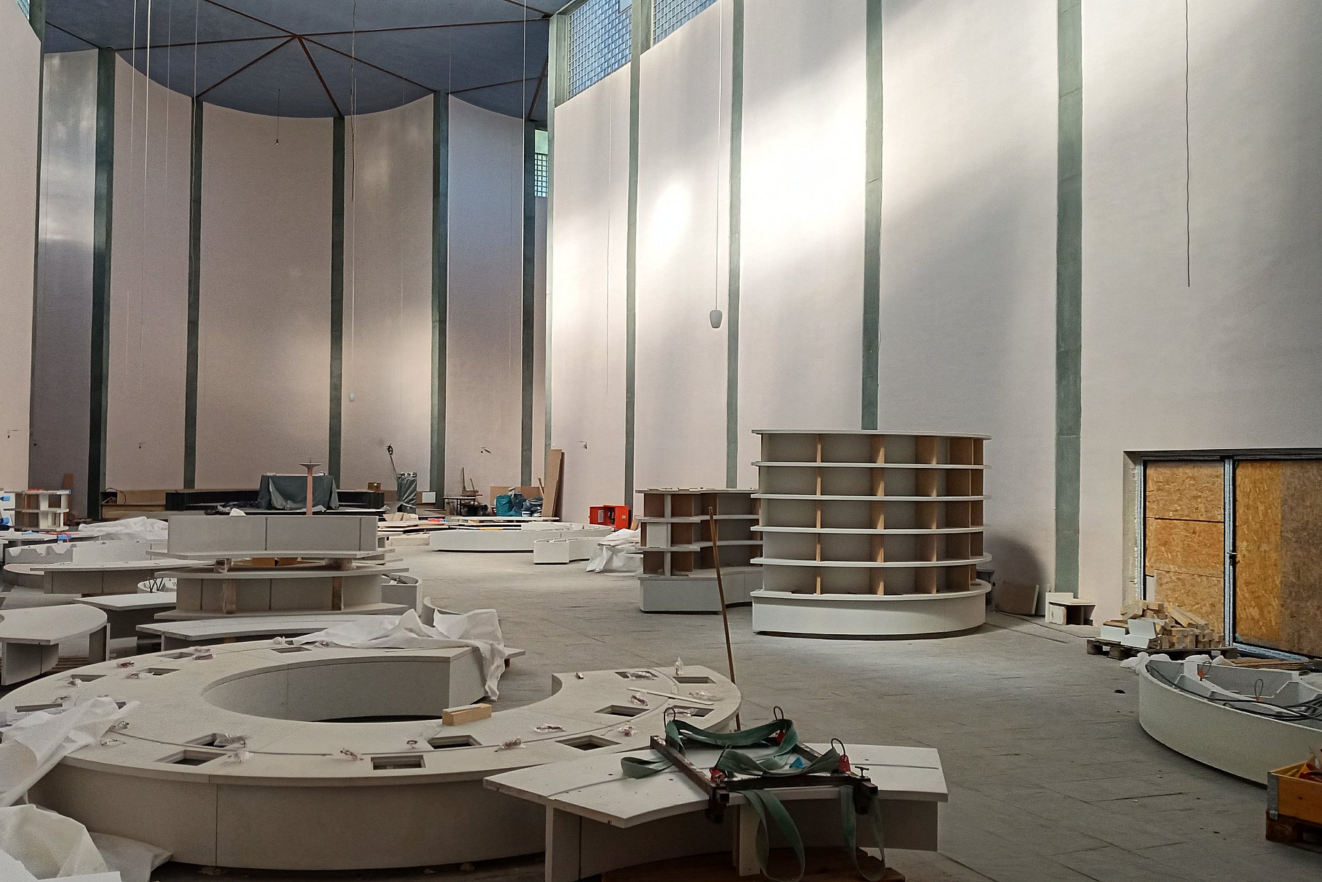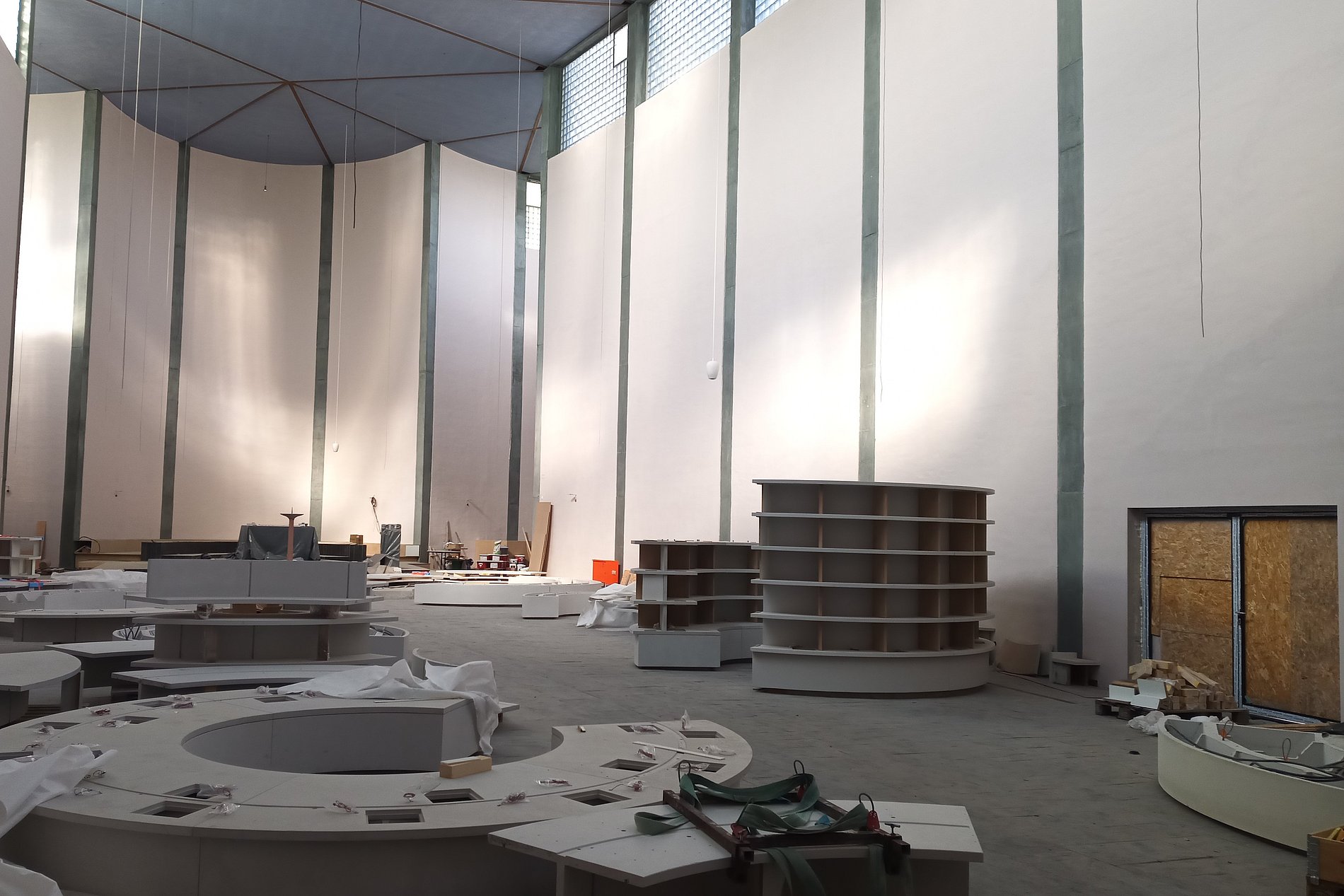 Im März und April 2025 wurden nicht nur rings um die Kirche, sondern auch in unserer Kirche große Fortschrite sichtbar. Der Innenraum wurde komplett eingerüstet. Die Sockel für die Urnenwände wurden gegossen und viele Kabel wurden verlegt.