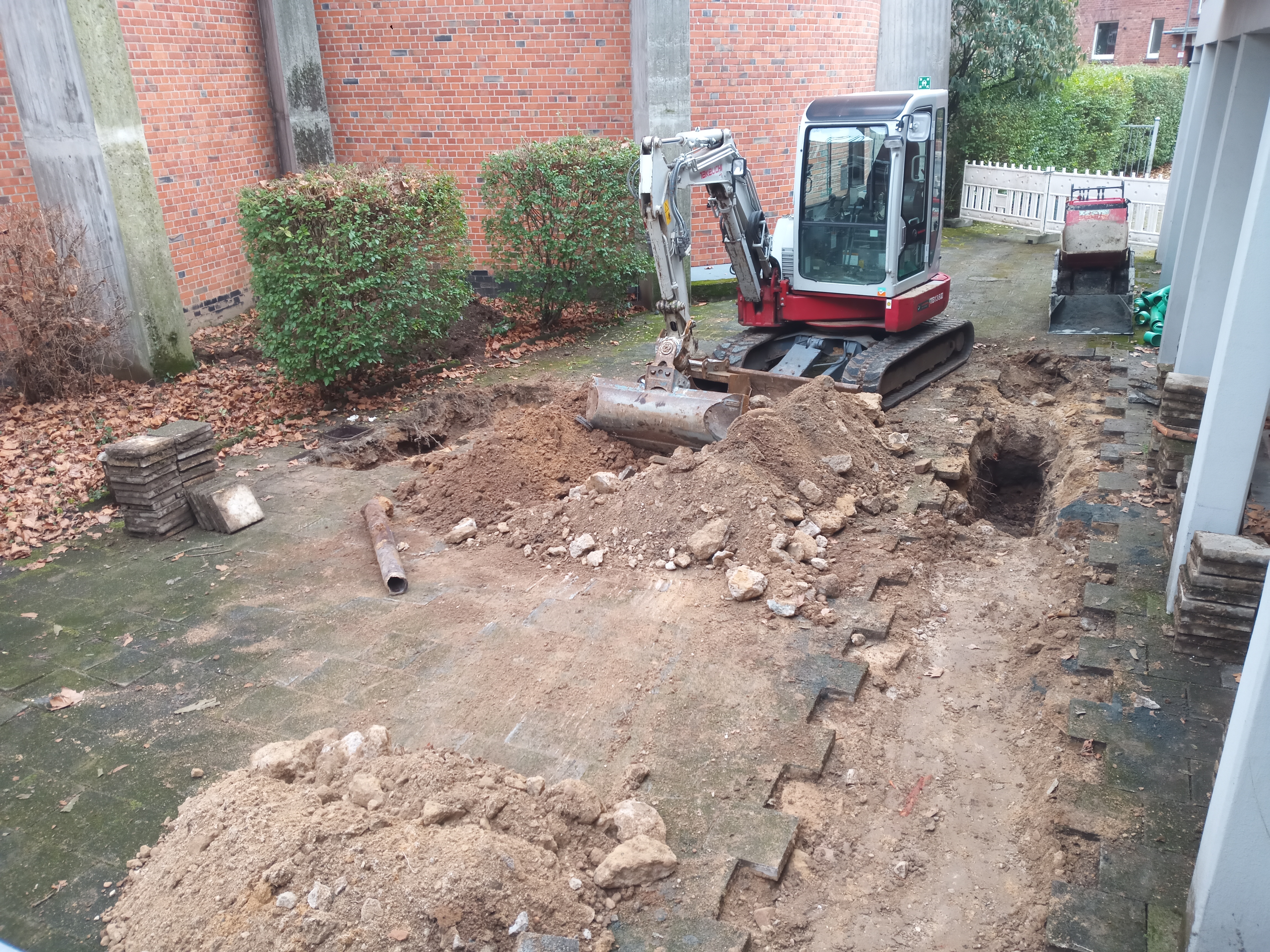 Im Februar 2025 wurde in unserem Hof und rings um die Kirche ganz viel an den Grundleitungen gearbeitet. Ein nicht mehr benötigter Windfang wurde abgebrochen. Man kann deutlich erkennen: hier ist eine Baustelle entstanden und es wird emsig gearbeitet. Wir sind froh und dankbar, dass es nun so richtig los geht.